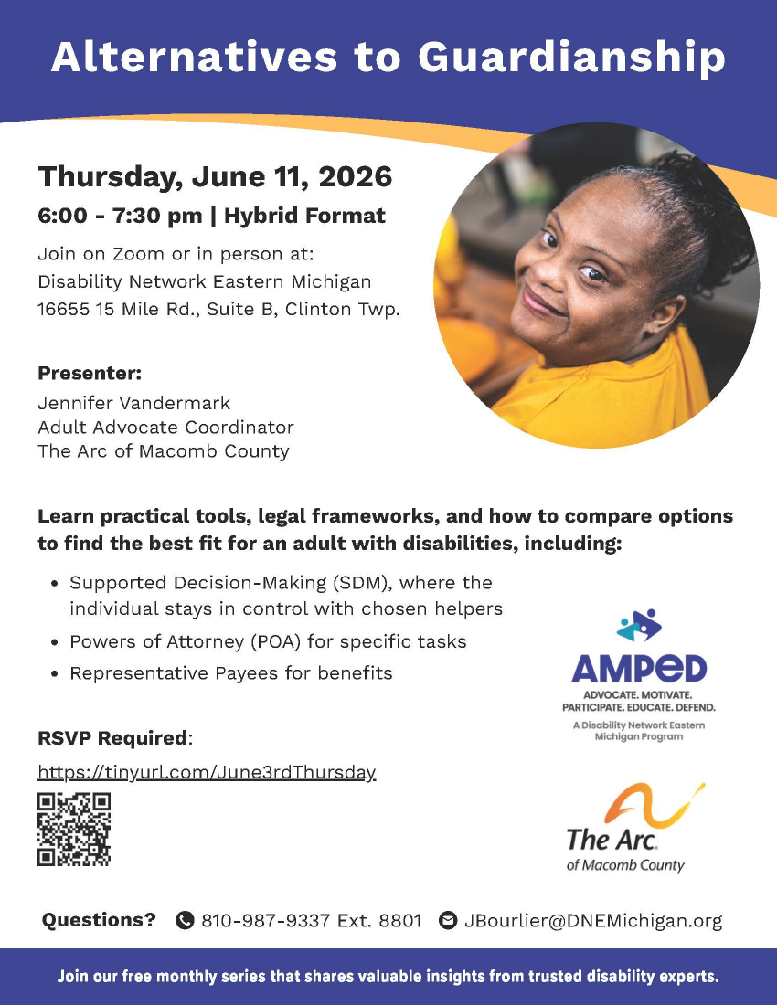 In this webinar, Jennifer Vandermar, Adult Advocate Coordinator at The Arc of Macomb County, will discuss alternatives to guardianship. Learn practical tools, legal frameworks, and how to compare options to find the best fit for an adult with disabilities, including: supported decision making, powers of attorney for specific tasks, representative payees for benefits.