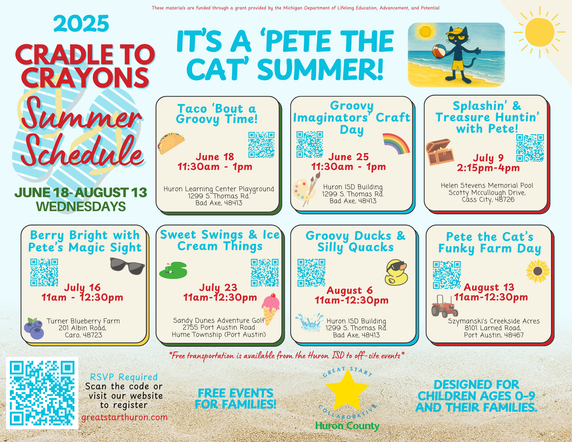 This event is open to Huron County residents only with children between the ages of birth - 9 years. Registration is required and closes on Friday, July 11 2025 at 3pm.