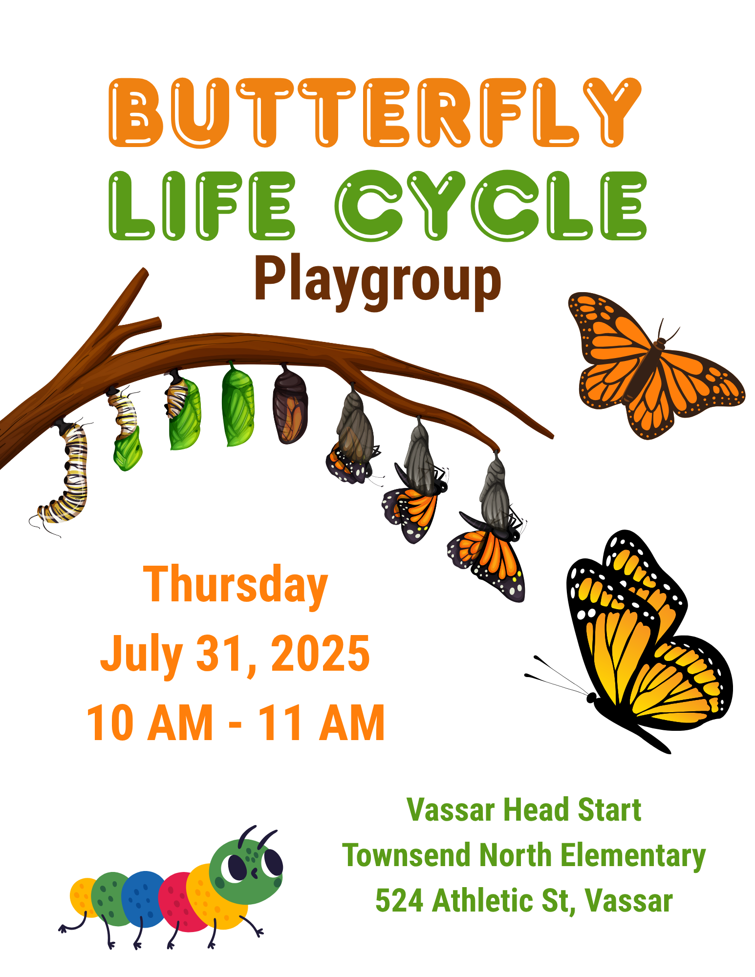 Free playgroup for children between the ages of 2 and 5 at NEMCSA Head Start. Butterfly-themed story and craft. All children must be accompanied and supervised by an adult.