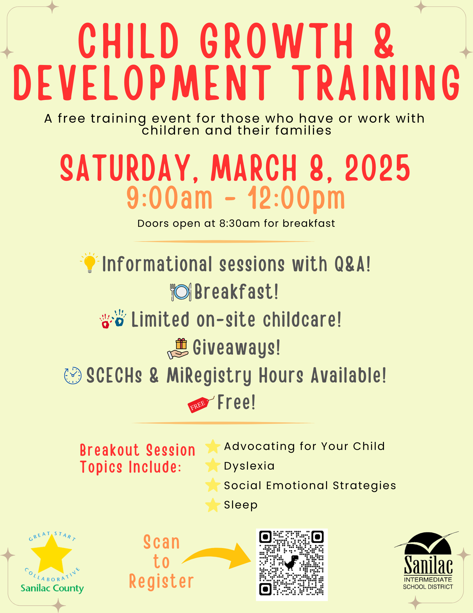 The Great Start Collaborative of Sanilac County is excited to announce Child Growth and Development Training on Saturday, March 8th from 8:30am to 12:00pm at Geiger Early Childhood Center, 15 S Howard Avenue in Croswell. This valuable event is free and open to all. Its goal is to provide current, relevant, and important education and resources to those who care for and work with children. A light breakfast will be provided as well as limited onsite childcare. Educator credits (SCECHs) and MiRegistry hours are available at no cost. To register, please complete the online form at https://forms.gle/s1gasvQPpkn6LqRa7 by February 28th. You can also email Great Start Family Liaison Rebecca at rnielsen@sanilacisd.org with questions.