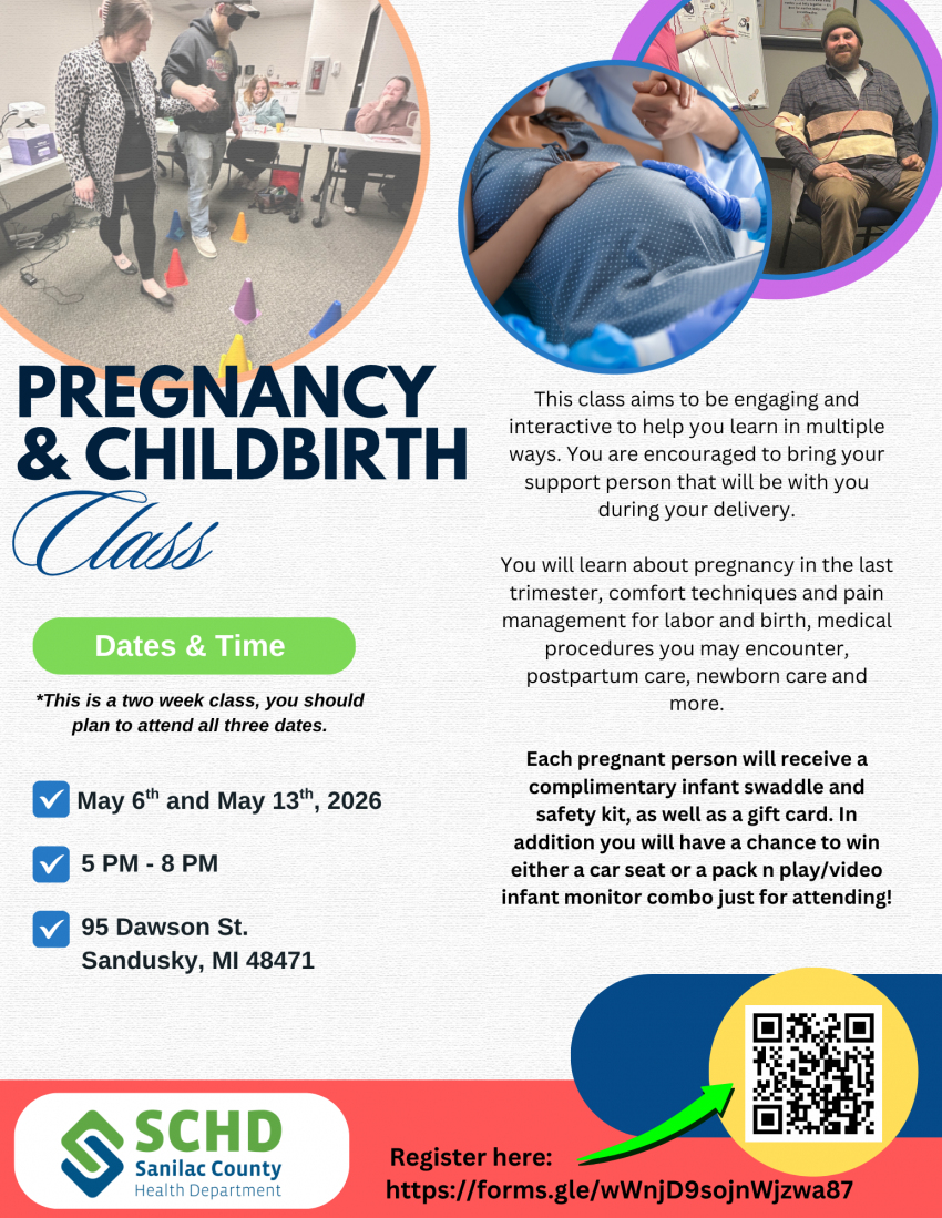 Sanilac County Health Department is providing FREE childbirth education to any pregnant person in Sanilac County. This 2-day course will be held on May 6th and May 13th, 2026. The class will be held at 95 Dawson Street, in Sandusky. (Located across the parking lot from the Sanilac County Health Department. Please plan to attend both dates.