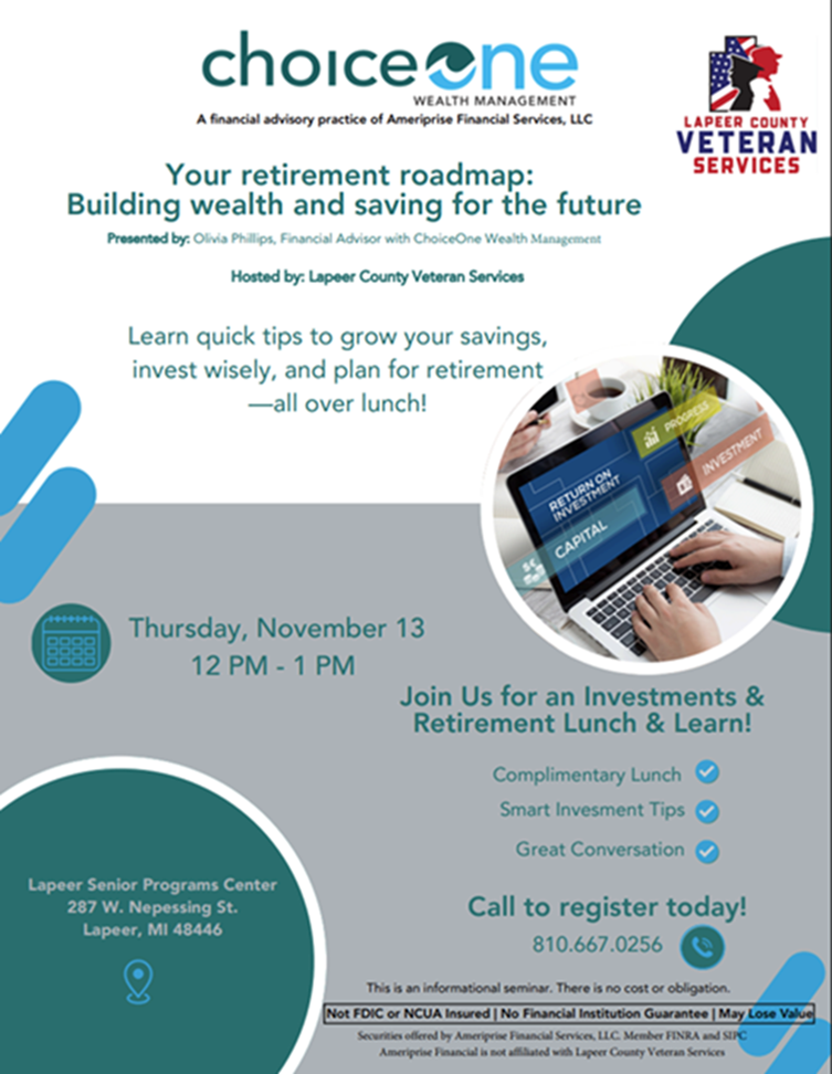 Learn quick tips to grow your savings, invest wisely, and plan for retirement-all over free lunch! Call to register today: 810-667-0256