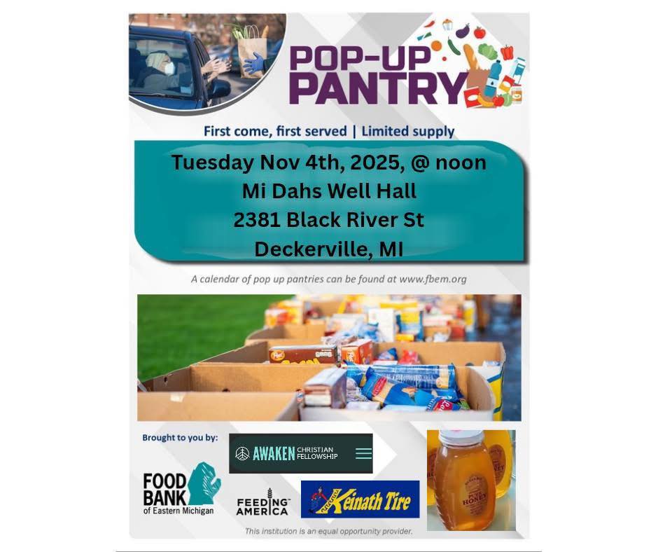 First come, first serve. Limited supply. Brought to you by Food Bank of Eastern Michigan, Awaken Christian Fellowship, Feeding America, Keinath Tire,