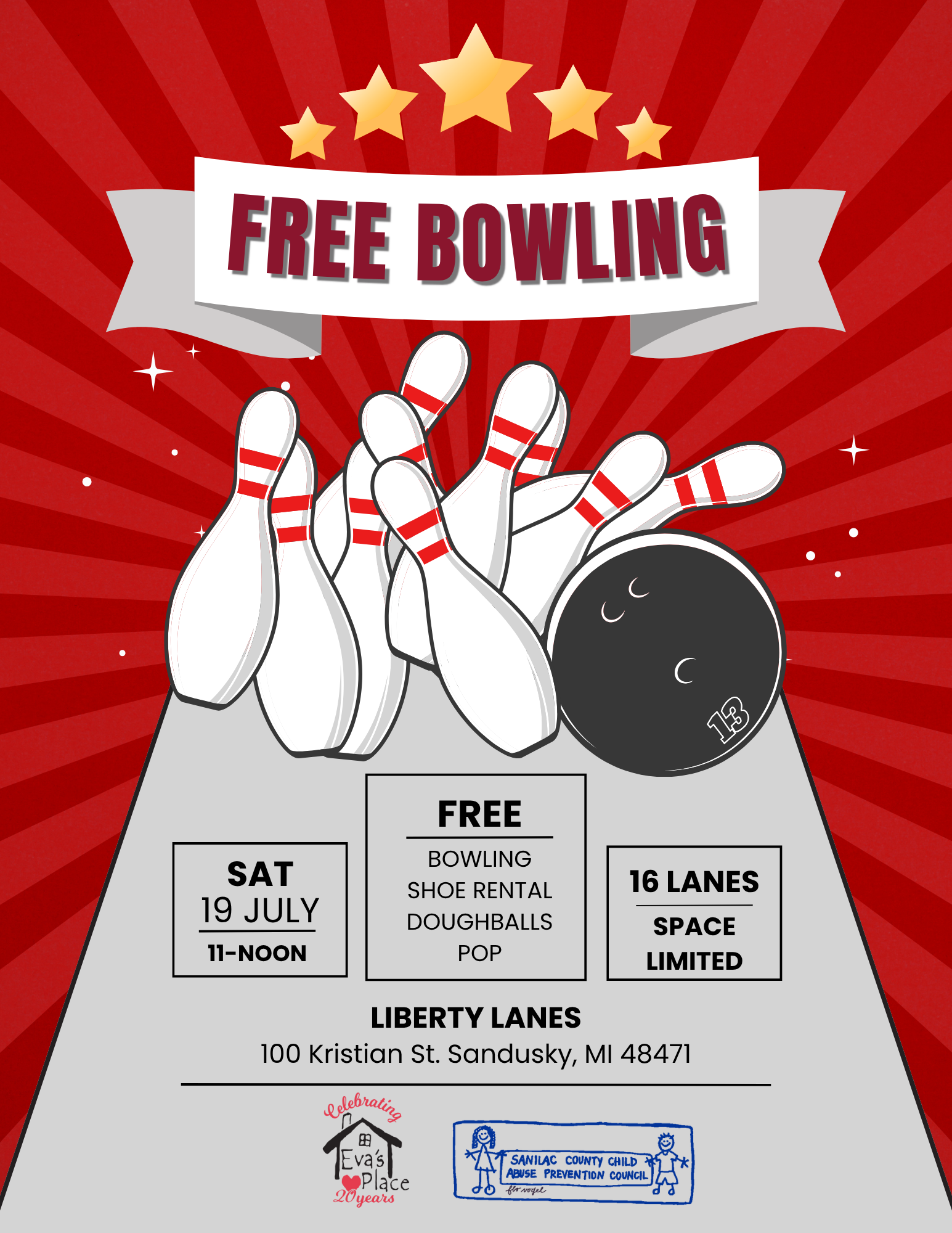 The Sanilac County Child Abuse Prevention Council and Eva's Place have partnered to offer some FREE family FUN this Summer! Come out to Liberty Lanes and enjoy a free game of bowling. Shoe rental and an order of doughballs & pitcher of pop are included. Space is limited.
