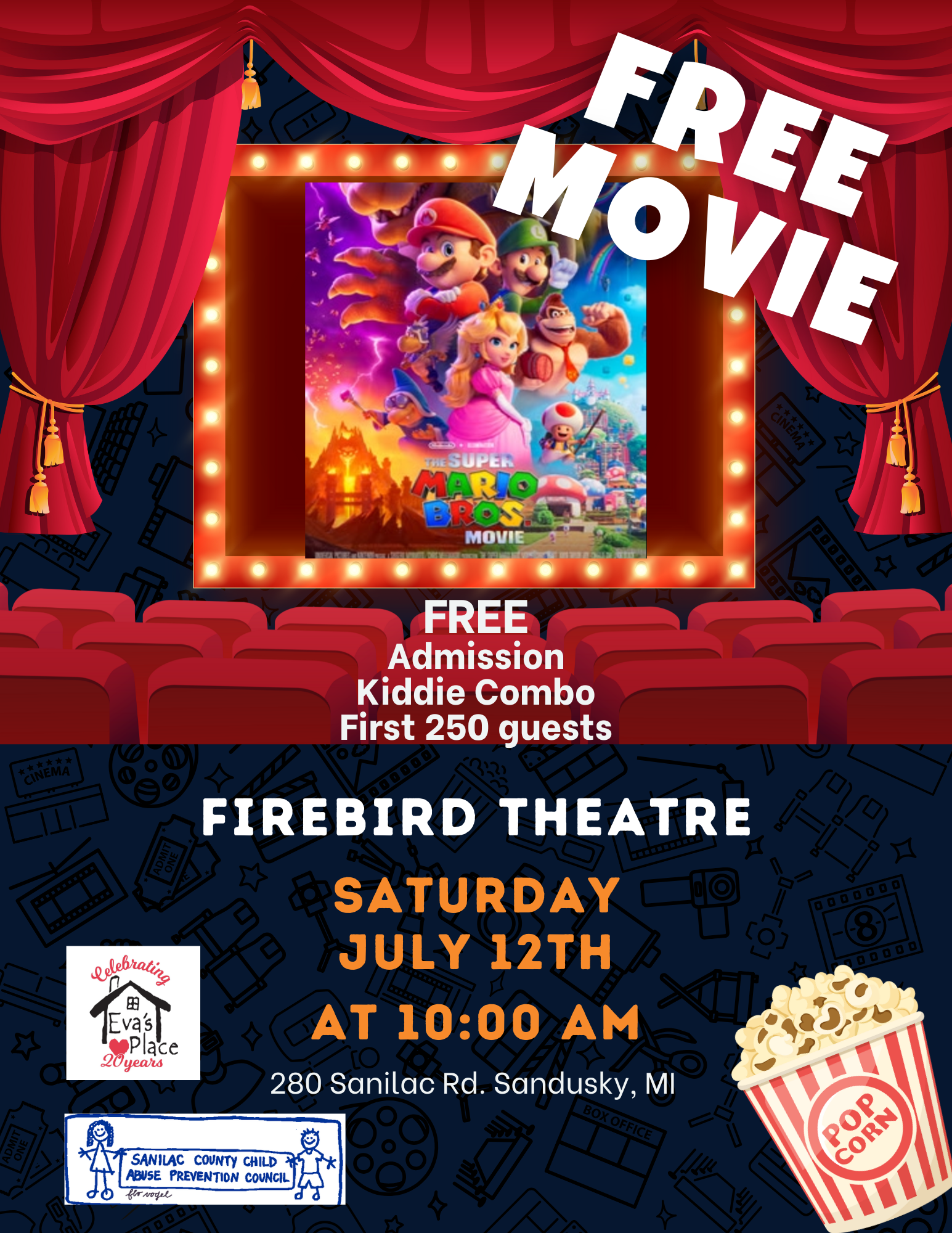 The Sanilac County Child Abuse Prevention Council and Eva's Place have partnered to offer some FREE Summer Family FUN! Free showing of Super Mario Bros Movie at Firebird Theatre in Sandusky. The first 250 guests will receive free admission and a free kiddie combo (popcorn and pop).