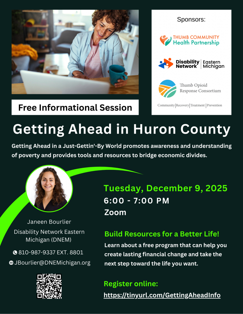Join us for a free informational session to learn about the Getting Ahead program. Getting Ahead in a Just-Gettin'-By World promotes awareness and understanding of poverty and provides tools and resources to bridge economic divides. Afterward, people can sign up for the free 16-session workshop. Getting Ahead is sponsored by the Thumb Community Health Partnership, the Thumb Opioid Response Consortium, and Disability Network Eastern Michigan.