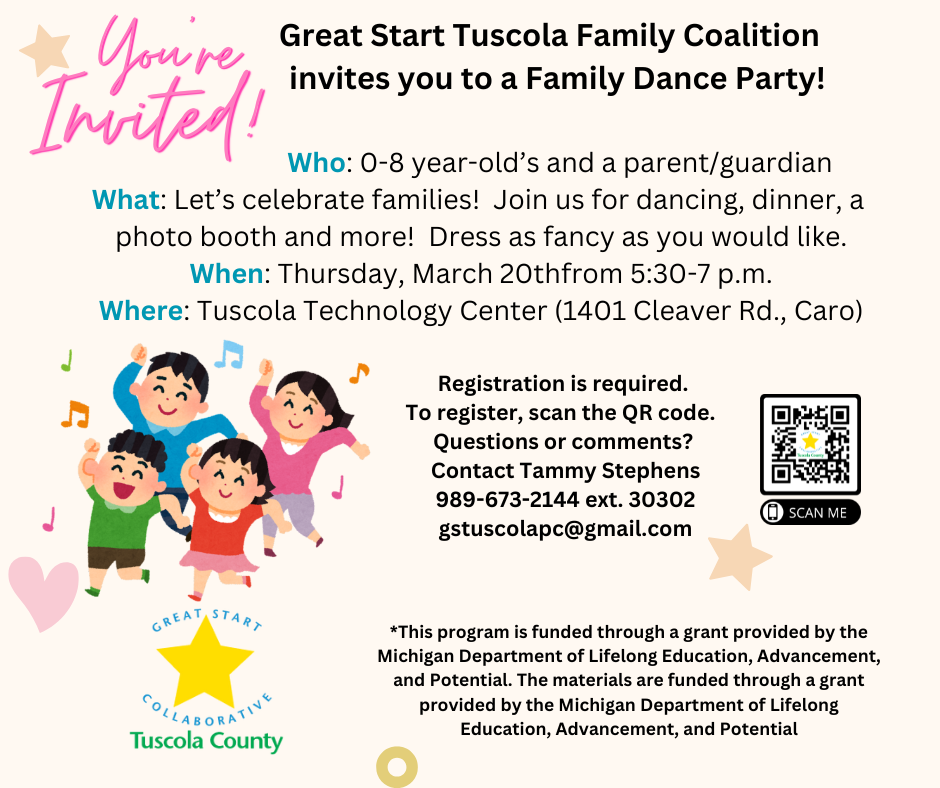 Great Start Tuscola Parent Coalition Dance Party! March 20th at 5:30 pm at the Tuscola Technology Center 1401 Cleaver Road Caro MI. Join us for dinner and a dance party!