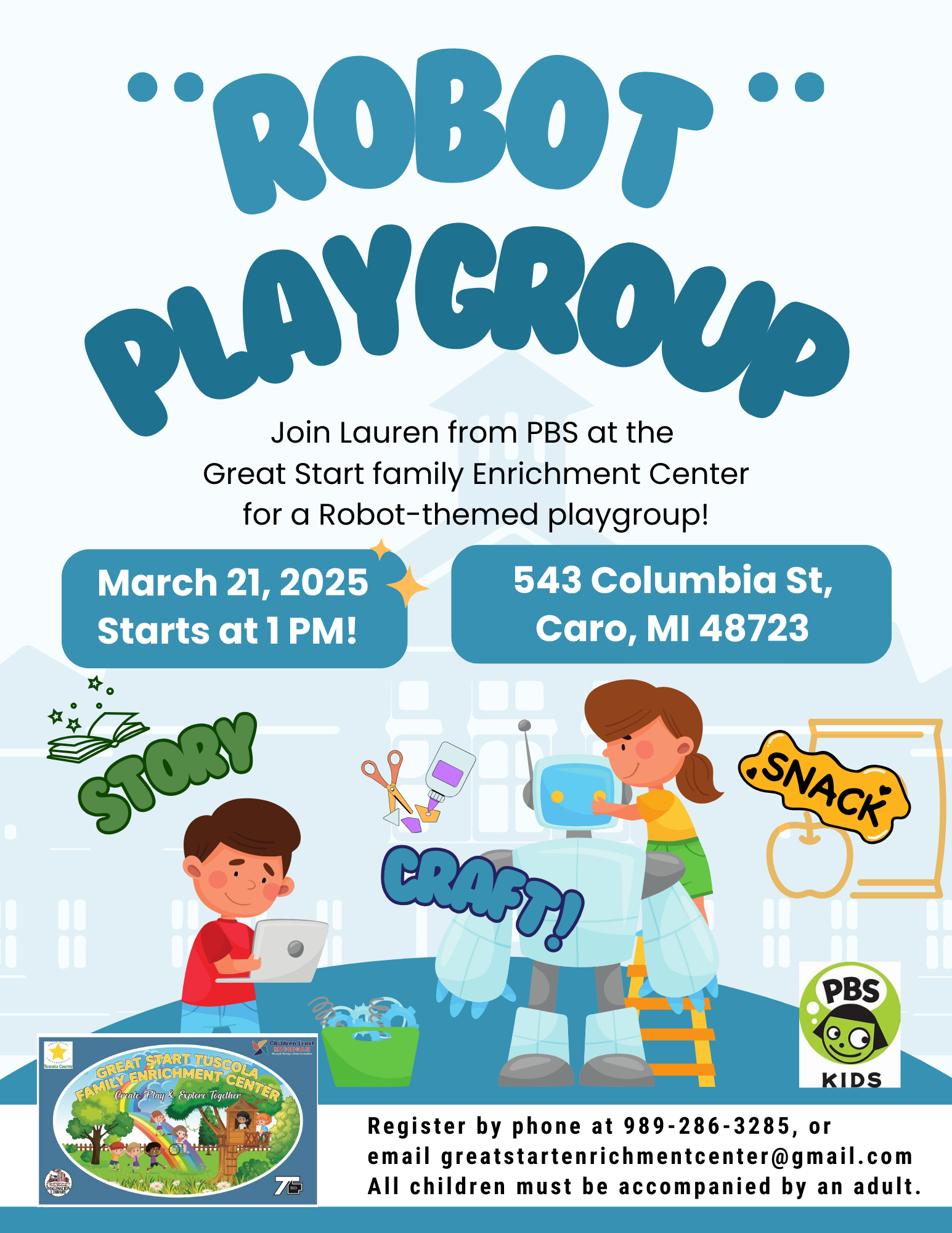 Children under age 5 and their adult can join us for a playgroup on March 21st at 1 pm at the Great Start Family Enrichment Center. Call 989-286-3285 or email greatstartenrichmentcenter@gmail.com to register.