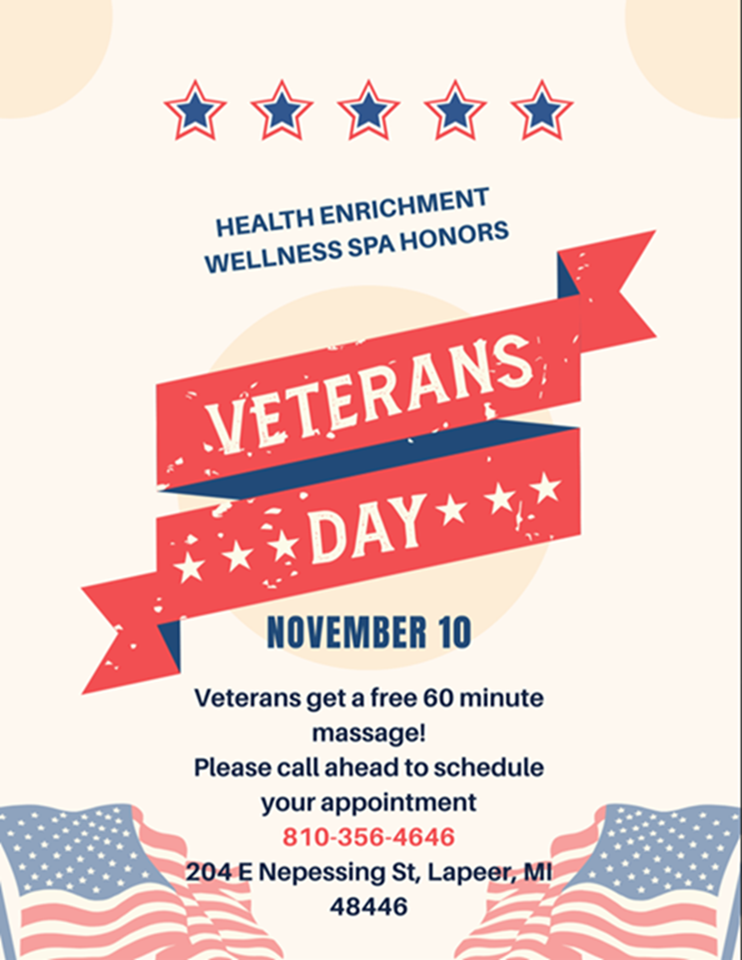Veterans get a free 60 minute massage! Please call ahead to book your appointment 810-356-4646