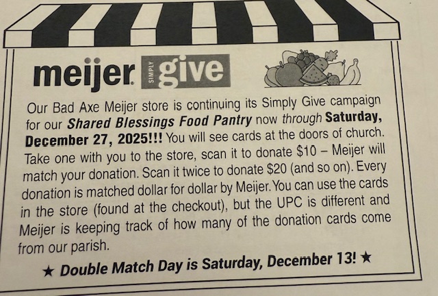 Bad Axe Meijer store is continuing its Simply Give Campaign for our Shared Blessings Food Pantry now through Saturday, December 27th. You will see cards at the doors of the church. Take one with you to the store, scan it to donate $10-Meijer will match your donation. Scan it twice to donate $20 (and so on). Every donation is matched dollar for dollar by Meijer. You can use the cards in the store (found at the checkout) but the UPC is different and Meijer is keeping track of how many of the donation cards come from our Parish.