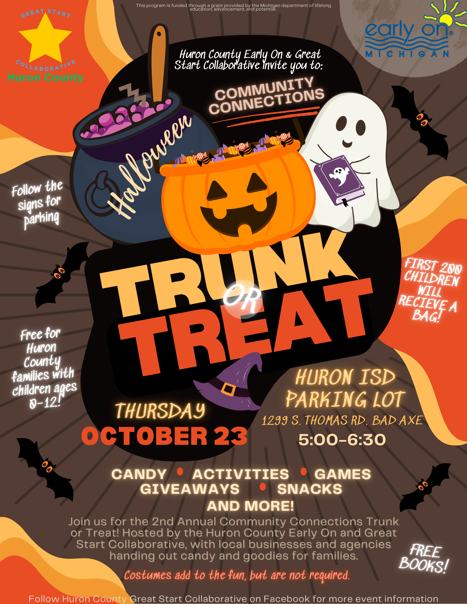 Huron County families are invited to join the Great Start Collaborative and Early On programs at the Huron Intermediate School District for a fun night of trunk or treating on October 23 from 5-6:30pm.
