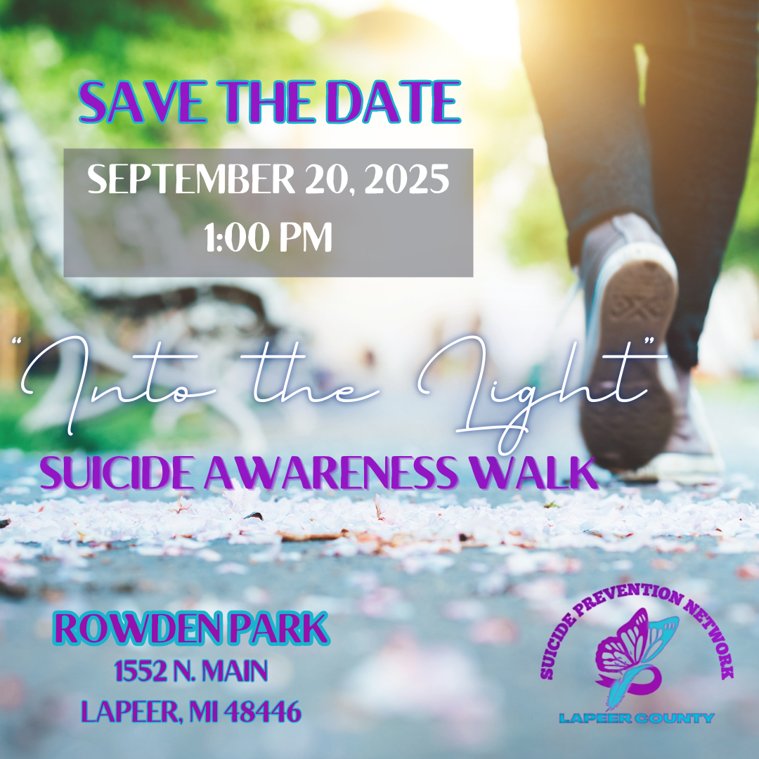 The Lapeer County Suicide Prevention Network will hold its 6th Annual Into the Light suicide awareness event on Saturday, Sept. 20 at Rowden Park in Lapeer, located at 1552 N. Main St. (across from McLaren Lapeer Region). Registration will begin at 11:30 a.m. A walk around the trail at the park will be held at 1 p.m. Food (Lunch chips, hot dogs, and bottled water) and T-shirts will be given free of charge along with other community resources.