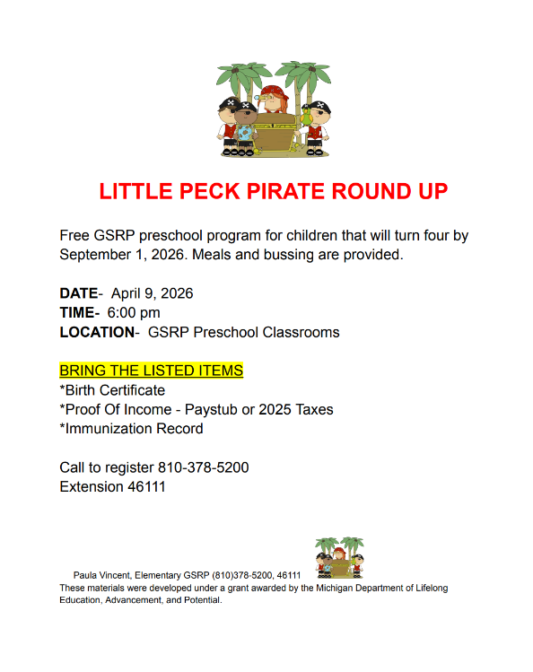 Free GSRP preschool program for children that will turn four by September 1, 2026. Meals and bussing are provided. Please bring: birth certificate, proof of income, immunization record Call to register: 810-378-5200 Ext. 4611