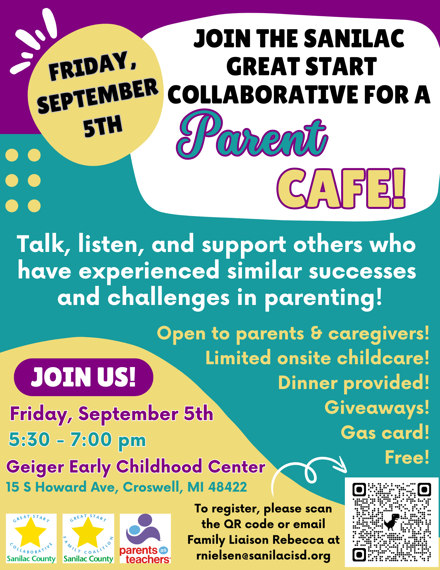 Join us as we talk, listen and support others who have experienced similar successes and challenges in parenting! Free! Open to parents and caregivers! Dinner, gas card and limited on-site childcare provided! Giveaways! Meet other families!