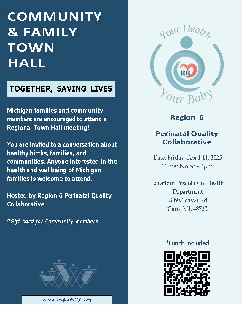 Anyone interested in the health and well being of families during pregnancy and baby's life is invited to attend. Lunch will be provided and all community members will receive a Thank You gift card. Tuscola County's meeting site will be at the Tuscola County Health Dept. 1309 Cleaver Rd. Caro 48723. Each county has a meeting site that is listed in the registration link or QR code.