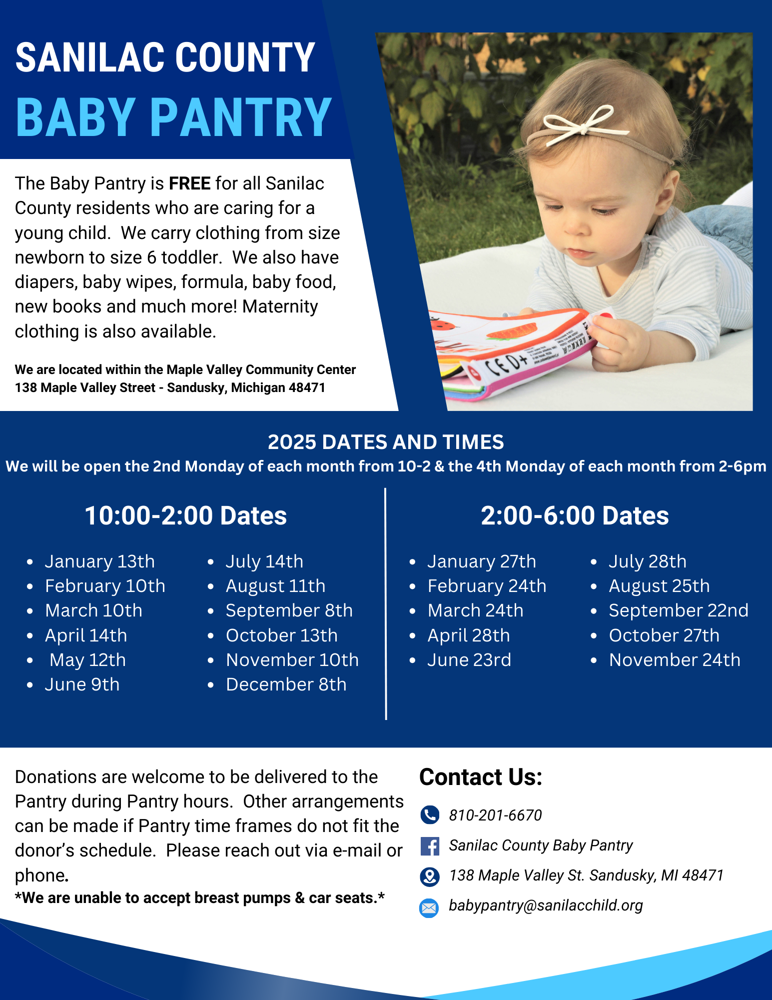 The Baby Pantry is FREE for all Sanilac County residents who are caring for a young child. We carry clothing from size newborn to size 6 toddler. We also have diapers, baby wipes, formula, baby food, new books and much more! Maternity clothing is also available. We are open the 2nd Monday of each month from 10-2 & the 4th Monday of each month from 2-6 p.m.