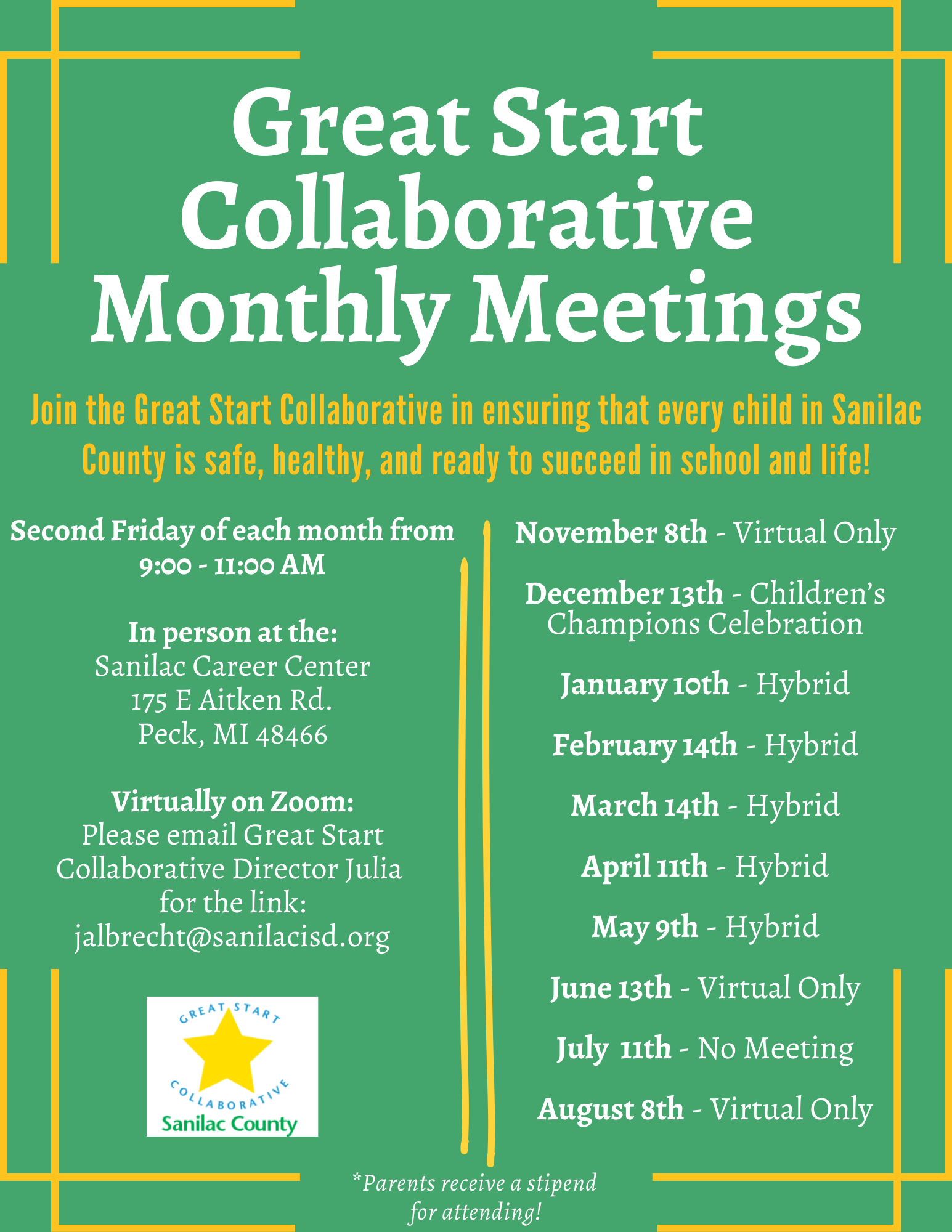 The Great Start Collaborative is a community-based initiative in Michigan aimed at ensuring that all children are ready to succeed in school and in life. It is part of the broader Great Start System, a statewide initiative designed to improve early childhood development, health, and education for children from birth to age eight. The Great Start Collaborative meets on the second Friday of each month (no meeting in July). Please reach out to Julia at jalbrecht@sanilacisd.org for more information!
