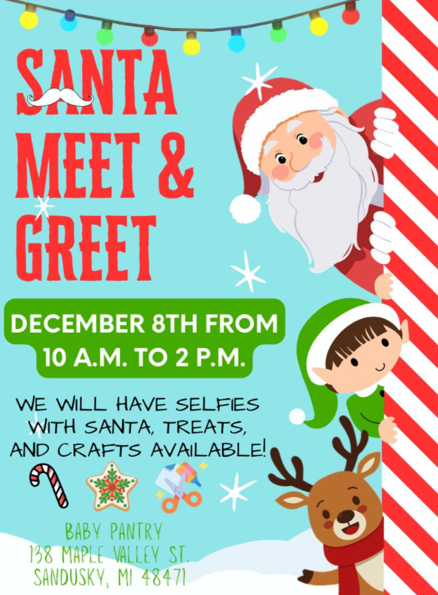 Santa meet and greet from 10 am to 12 pm Selfies with Santa, treats, and crafts available