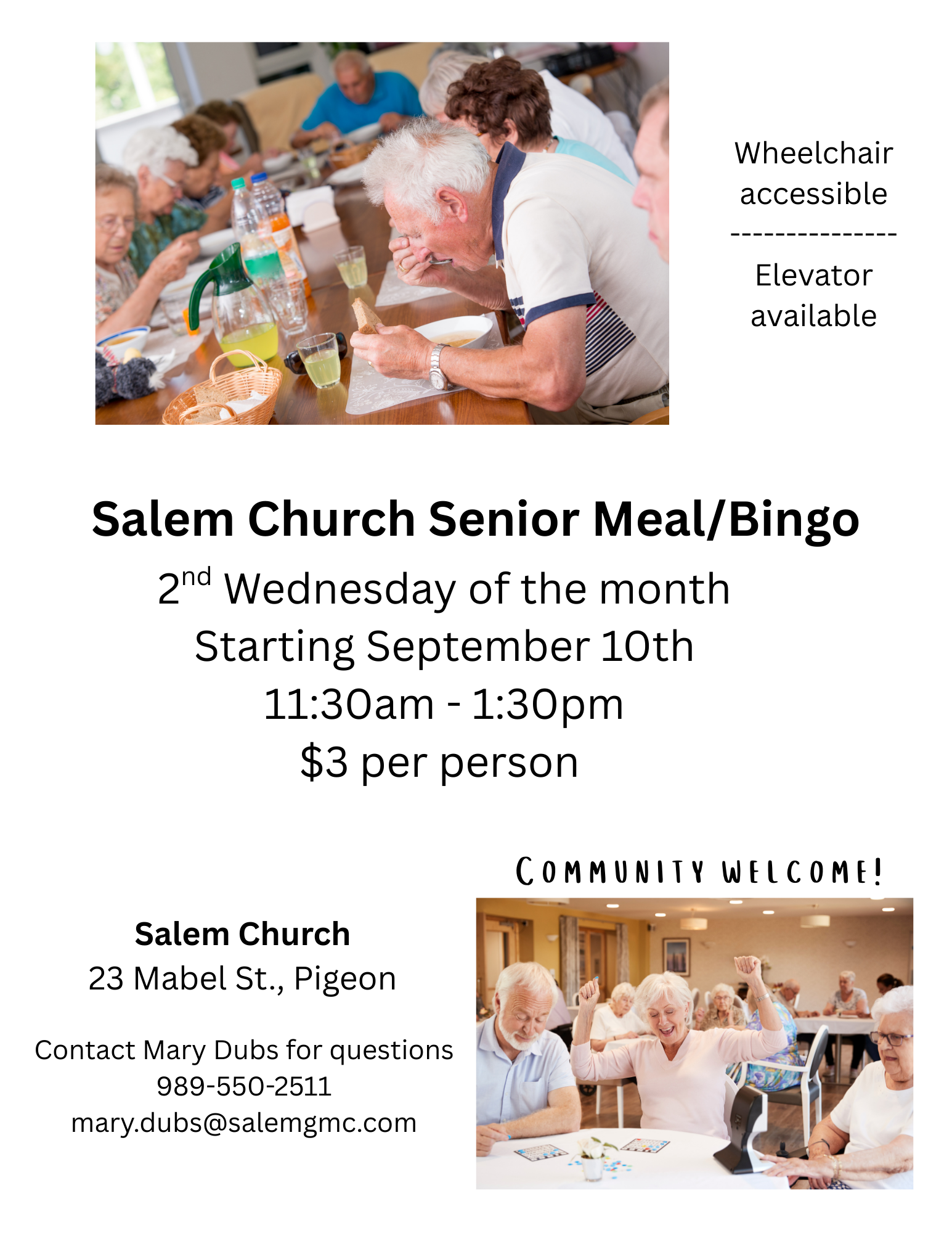 Held the second Wednesday of each month at Salem Church in Pigeon. Suggested donation of $3, but all are welcome.