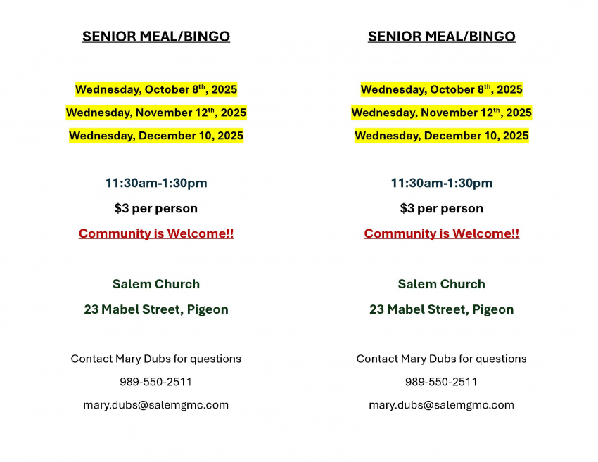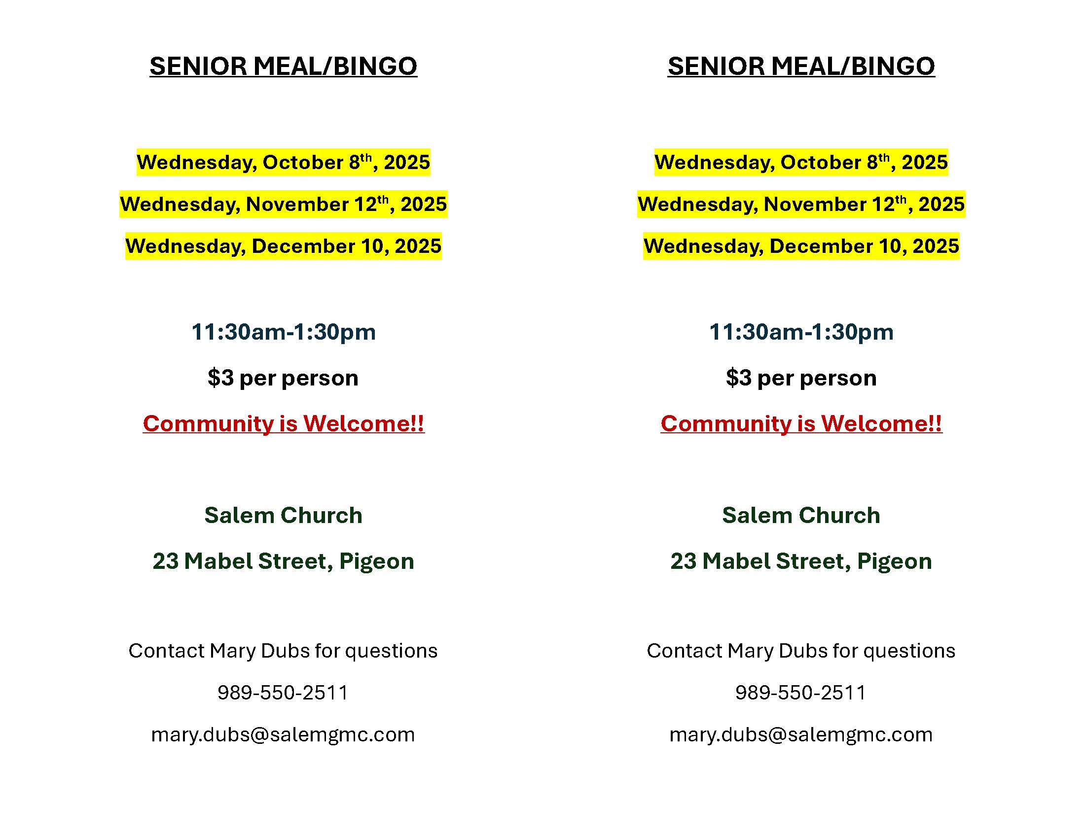 $3 per person Community is welcome Contact Mary Dubs for questions 989-550-2511 or mary.dubs@salemgms.com