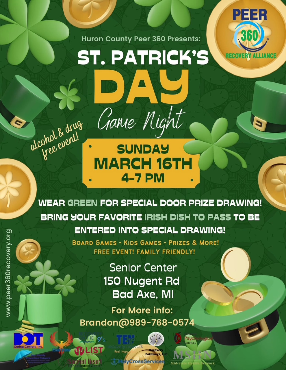 Wear Green! Bring your favorite Irish Dish to pass! Family Friendly, games, prizes and more! Contact Brandon for more information @ 989-768-0574