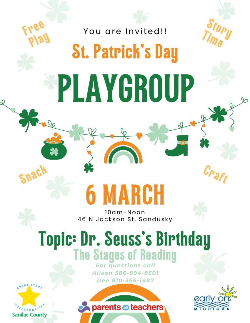 Free play, story time, snack, and craft Topic: Dr Seuss's Birthday For questions call Alison: 586-894-8501 Dee: 810-366-1487