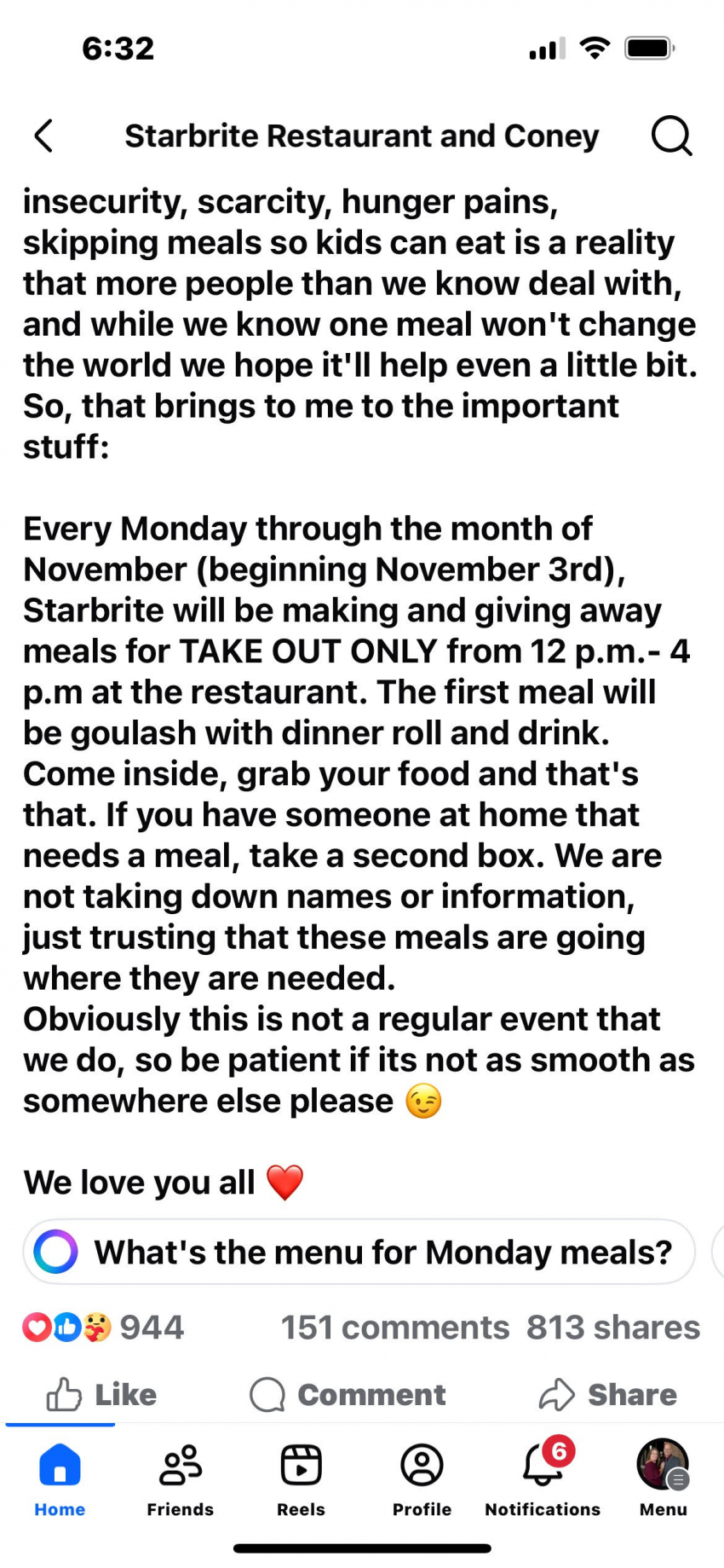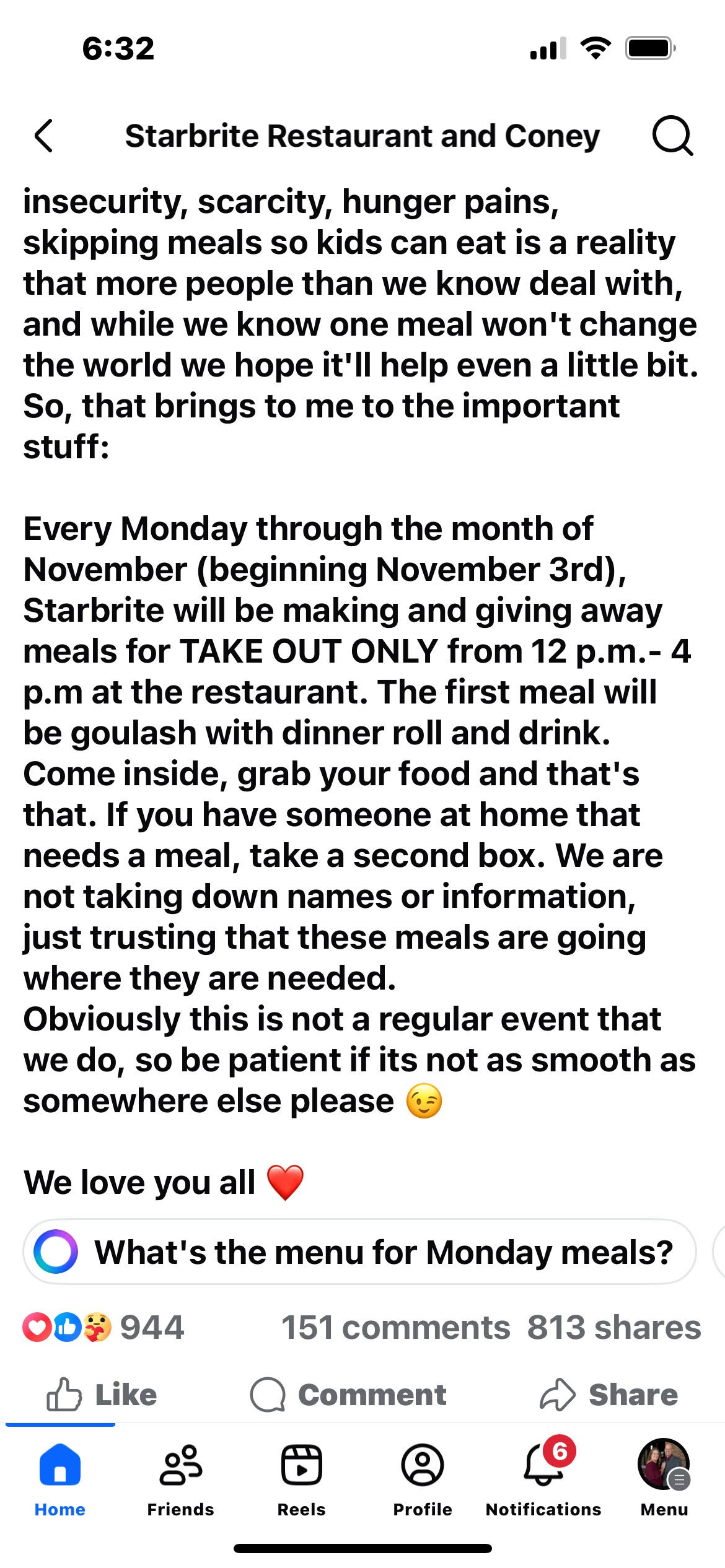 Starbrite in Caro is offering free TAKE OUT meals on Mondays in November from 12-4PM