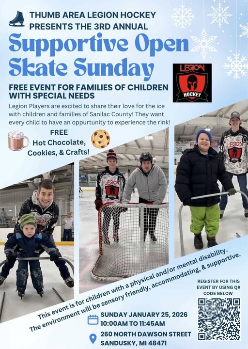 Thumb Area Legion Hockey with Sanilac County Hockey Association is hosting the 3rd Annual Supportive Open Skate Sunday. This event would not be possible without collaboration from Sanilac County ISD and Sanilac County CMH⛸️??