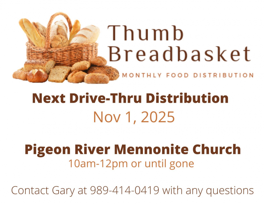 Drive thru food distribution at Pigeon River Mennonite Church on 11/1 from 10AM-12PM or UNTIL GONE Contact Gary at 989-419-0419 with any questions
